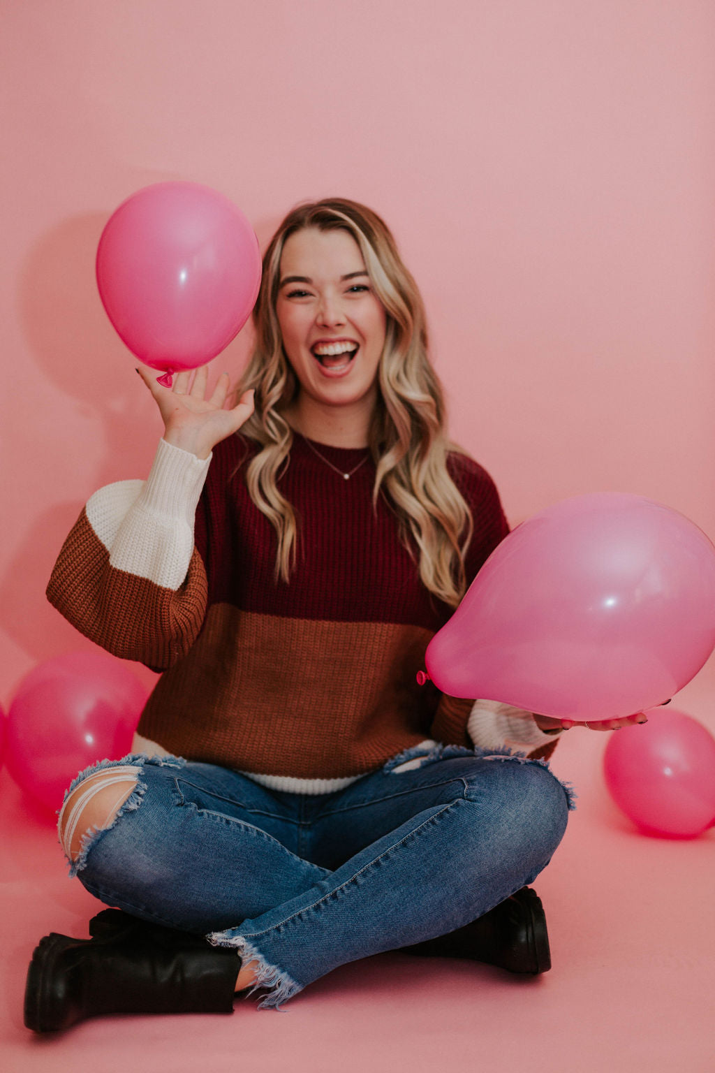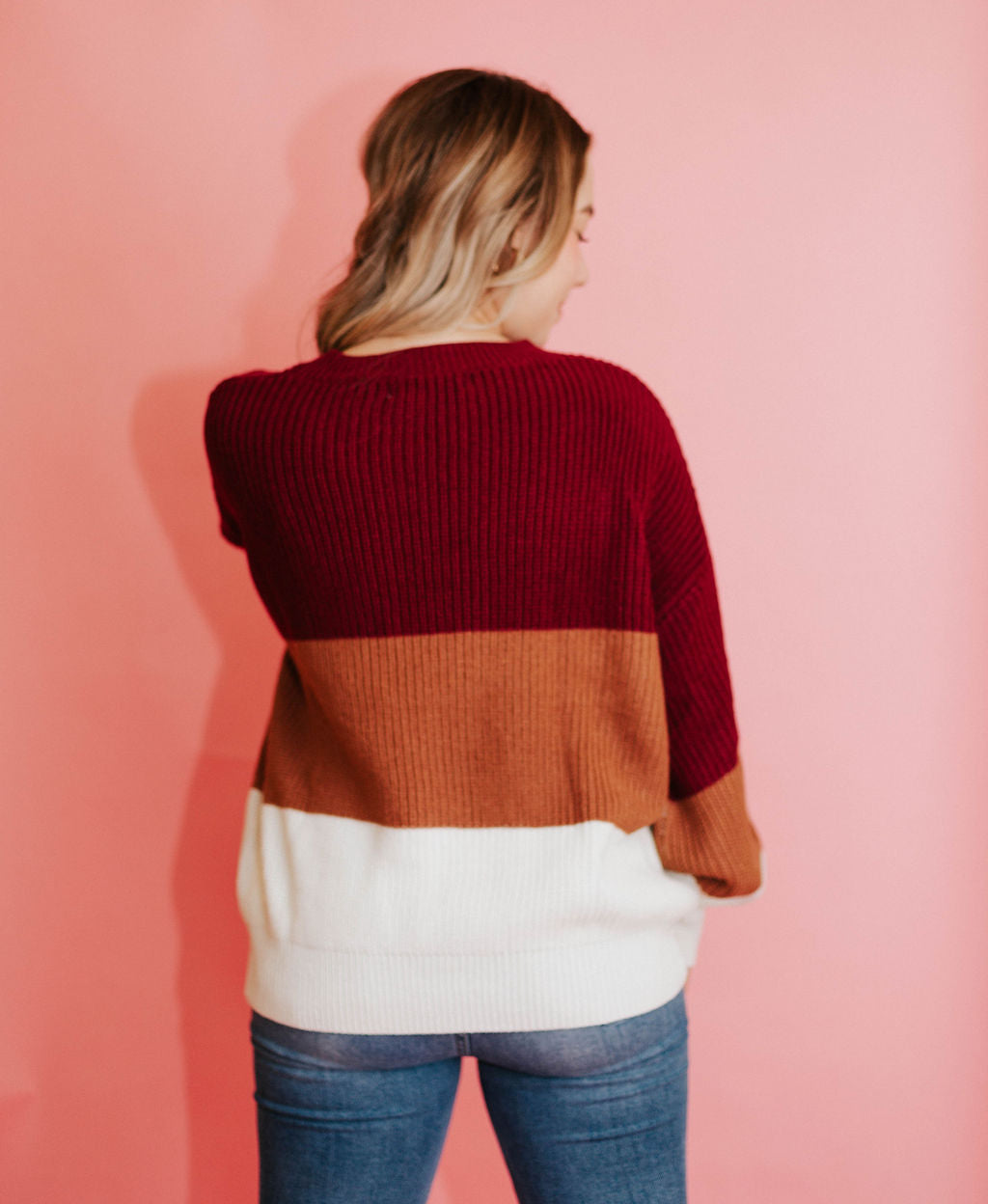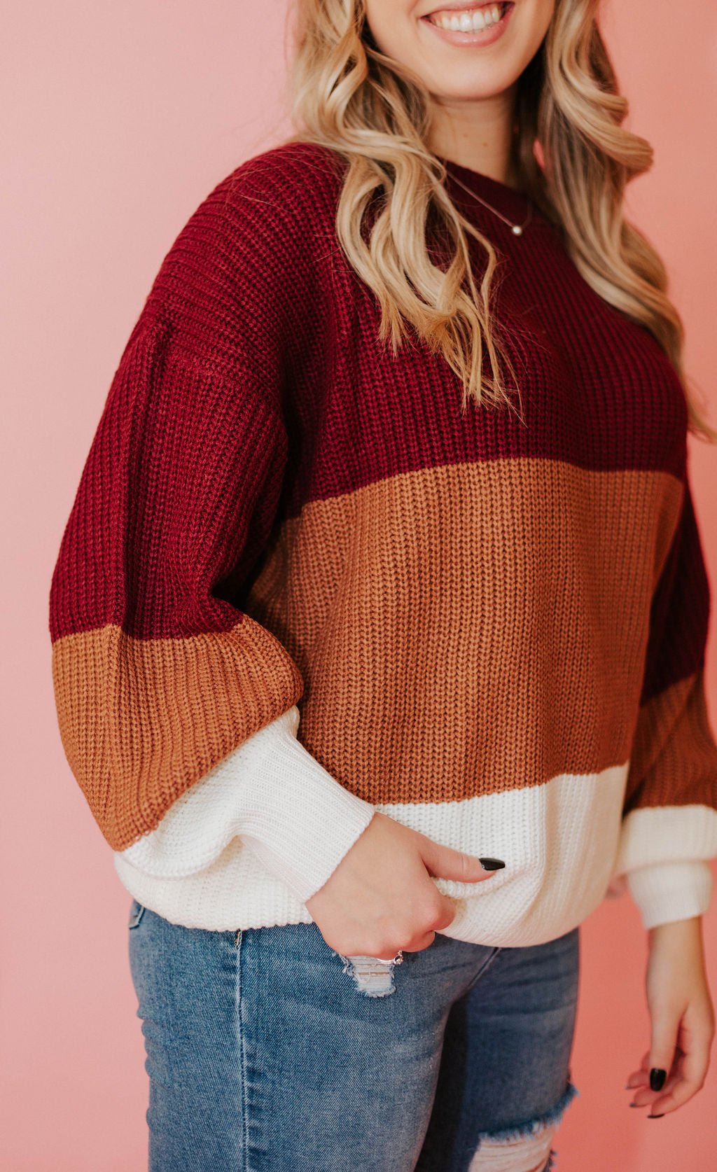 It features a super trendy color block style and balloon sleeves.